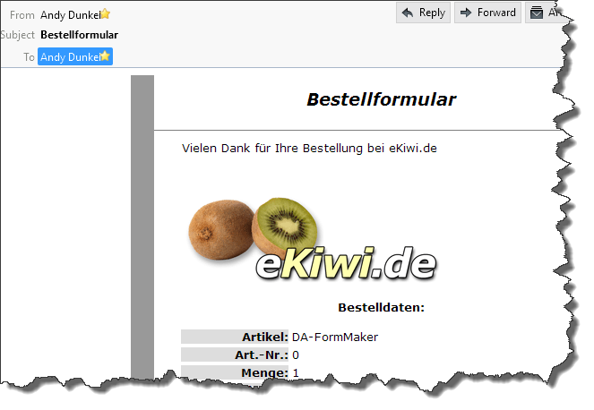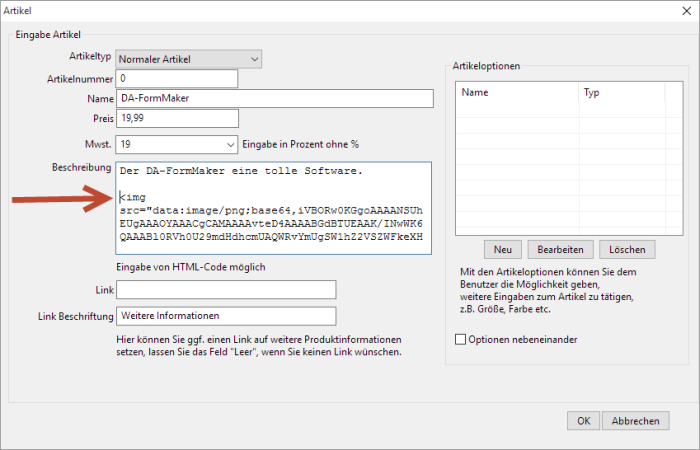 Bilder lassen sich in DA-BestellFormular mittels HTML-Code in das Formular einbinden. Neben der externen Verlinkung, lassen sich die Bilder auch direkt ins Formular einbetten.