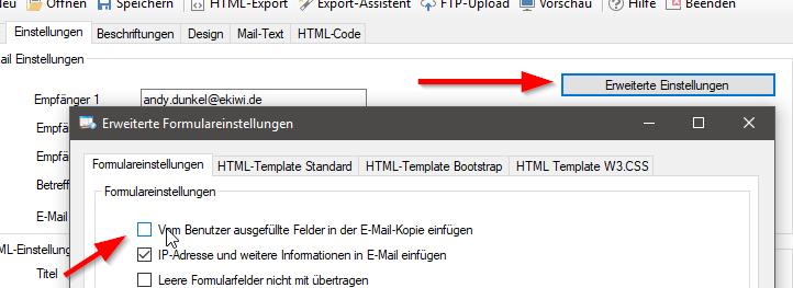 In den Erweiterten Einstellungen können Sie nun noch die Option deaktivieren, dass der Absender seine eigenen Eingaben erneut übermittelt bekommt: