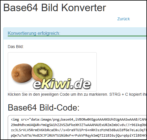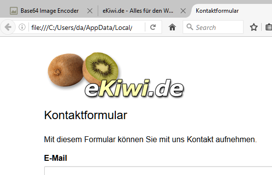 Will man keine weiteren Abhängigkeiten haben, kann man das Bild auch als Base64-Bild einfügen. Dazu muss das Bild zuerst in das Base64-Format konviert werden. Dies geht z.B. auf eKiwi.de.