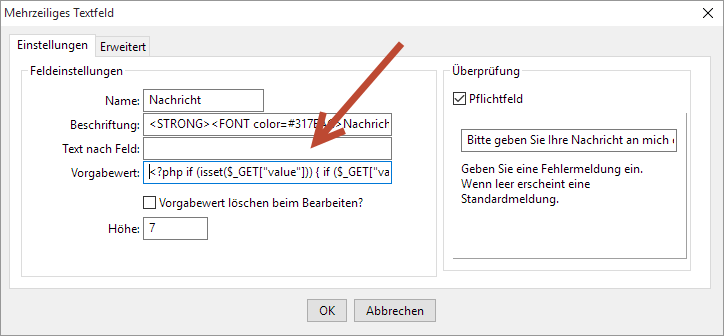 Wie man sieht, haben wir drei Vorgabewerte. Diesen Code müssen wir nun in den Vorgabewert eintragen: